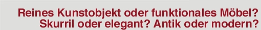 All diese Fragen stellen sich dem Münchner Möbeldesigner Stefan Weckesser nicht, denn in seinen Möbelobjekten hat der gelernte Schreiner all diese Eigenschaften harmonisch vereint. Und eben das macht diese limitierte Serie so originell und außergewöhnlich: Das Herzstück jedes einzelnen Kunstwerks ist ein alltäglicher und ausgedienter Gebrauchsgegenstand, der mit einem Höchstmaß an Kreativität und handwerklichem Geschick einer völlig neuen und überraschenden Identität zugeführt wird. Egal wie unterschiedlich die einzelnen Alltags-Fundstücke auch sein mögen-ob ein antiker gußeiserner Toilettenspülkasten mit cardinalrotem Samt gepolstert zur Sitzfläche eines Sessels wird oder eine Waschmaschinentrommel seine neue Funktion als Korpus einer Bar findet-die Möbelobjekte lassen immer die kreative Handschrift Weckessers erkennen. Denn die Fundstücke sind durchgehend verspielt und kunstvoll eingebettet in eine edel geschwungene Holzskulptur, die sich, manuell und perfektionistisch gearbeitet, wie ein "roter Faden" durch die gesamte Möbelserie "Objets trouvés" zieht. Eine exzellent gearbeitete Synthese von Alt und Neu gepaart mit einem unschlagbaren Sinn für das Außergewöhnliche und dem feinen Gespür für harmonische Formgebung, die seinesgleichen sucht. |
